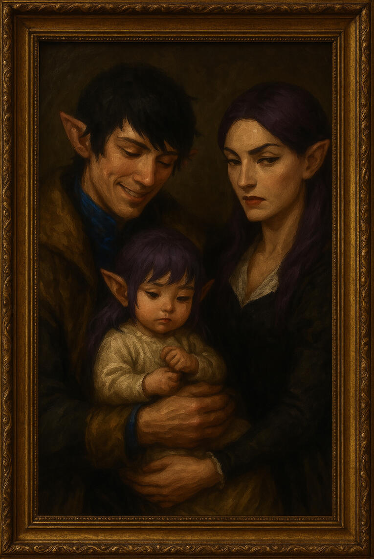 The night her soul met the world, the moon hung low and swollen, casting an ethereal glow over the jungle canopy, like milk cascading over ancient stone. The thick foliage of the Skatay Range lay untouched, far beyond the reach of any scholar's pen or ink, where the mysterious contours of the land defied borders. Here, a clearing throbbed with the energy of an ancient ceremony. The Veena, a secluded tribe nestled among roots as old as time itself, gathered in this sacred space, where time wove its dance in circles rather than lines.Mist slithered low among moss-covered stones, kissed by the gentle lavender luminescence of ceremonial braziers. The flames, ethereal and ghostlike, flickered with a blue hue, swaying gracefully without consuming their surroundings. They were summoned not by mere sparks but by the mystical dance of aether.At the center of the glade lay a shallow spring, shimmering like liquid water crystal, its surface unperturbed by breeze or beast. Encircling it, twelve figures moved in perfect harmony, dancers of the tribe—Veena, both male and female, their roles blurred under the weight of ancient tradition. Garments crafted from fine silk and thread whispered softly against their pale skin, while anklets chimed in synchrony with their steps. Every fluid motion fed the flames, which glowed with an ever-intensifying blue, brighter and purer with each passing moment.A birth was imminent. A sacred event awaited.High Matron Sylvha stood at the water’s edge, her eyes locked on the laboring form of her own daughter, Aeryla, who lay atop a bed of petals and woven grass. Aeryla gripped her swollen belly with trembling hands, her knuckles white, her back arched in waves of anguish. Sweat glistened on her brow like morning dew, and her breath came in sharp, desperate gasps. The pain was primal.She did not scream, not at first. But as the contractions grew fierce and unrelenting, a single cry tore from her lips, high and sharp, breaking the reverent silence like thunder across still water. The dancers paused, but did not falter.With a final push, Aeryla gave birth. And unlike the stillness that preceded it, the child emerged with a voice that shattered the night.A sharp, keening wail—so piercing and pure that the flames erupted in a sudden, violent crescendo. The spring rippled. The dancers halted mid-step, and then——they cheered.A sound of awe, of joy. Their cries rang through the jungle like birdsong woven into wind.Matron Sylvha took the slick, shivering newborn into her arms and raised her into the moonlight. The child's skin, soft as snow’s first melt, bore an extraordinary mark—a smoldering brand in the shape of a curling flame that stretched elegantly from collarbone to breast.The child was small—far smaller than most Veena babes born before her. Her limbs were delicate, her fingers curled like wisps of smoke, and her breath came quick and sharp, as though the world had rushed to greet her before she was ready. This tribe were known for their lithe and slender frames, their bloodlines traced through generations of subtle, quiet people who moved like leaves through the wind. Even among them, she was a slip of a thing.The moment was sacred. There were no commands, no pomp. Only bowed heads and reverent silence, save for the newborn’s cry—an echo of fire in the heart of the wood. This was how the tribe greeted their young: not with fanfare, but with awe and devotion. A celebration not in sound, but in spirit. . There were no commands, no pomp. Only bowed heads and reverent silence, save for the newborn’s cry.
